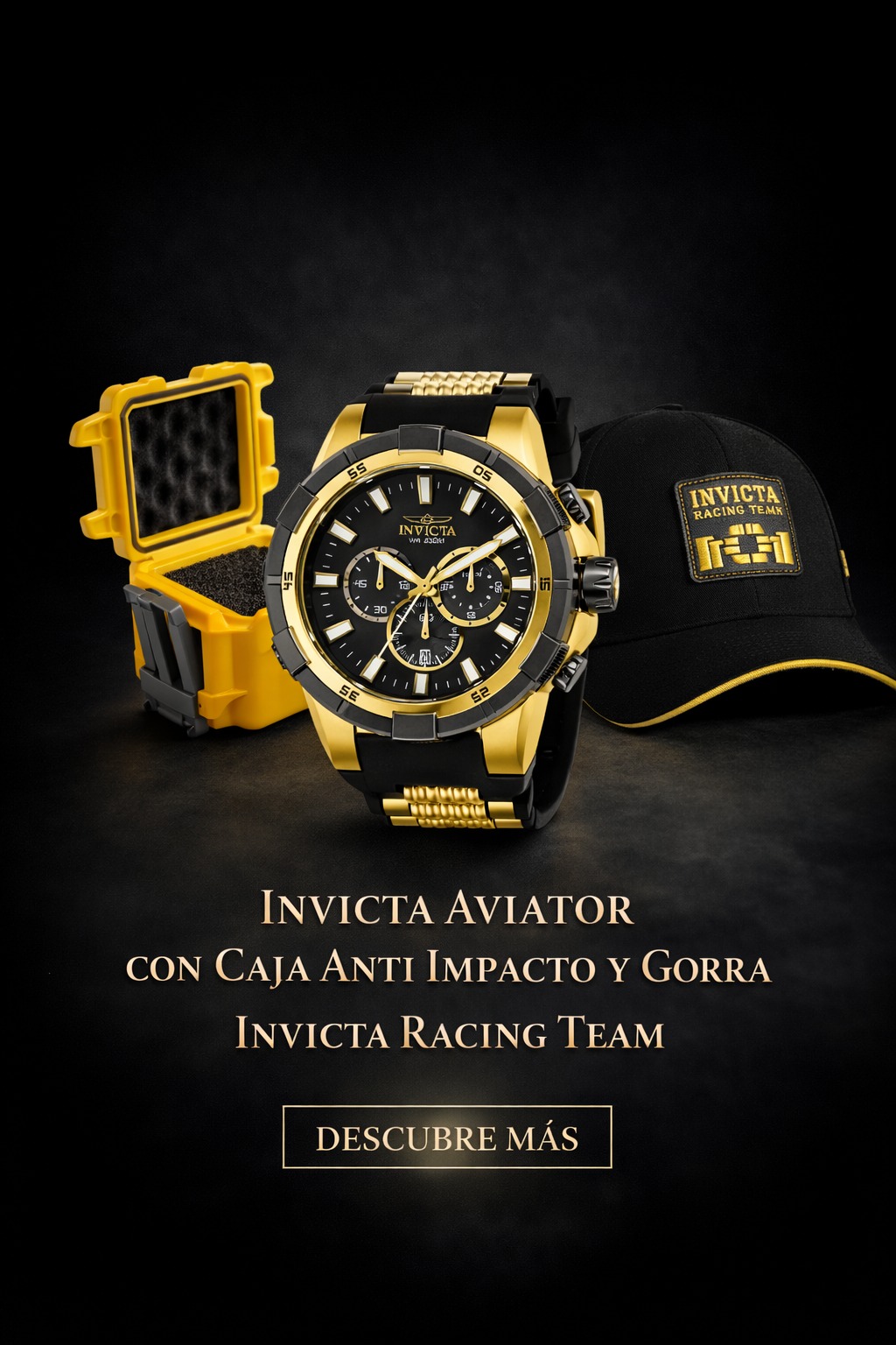 El Invicta Aviator es un reloj masculino diseñado para quienes buscan presencia, resistencia y estilo deportivo. Su sólida caja de acero inoxidable dorado se combina con un bisel negro y una esfera negra con subesferas funcionales, logrando una estética fuerte y moderna.
