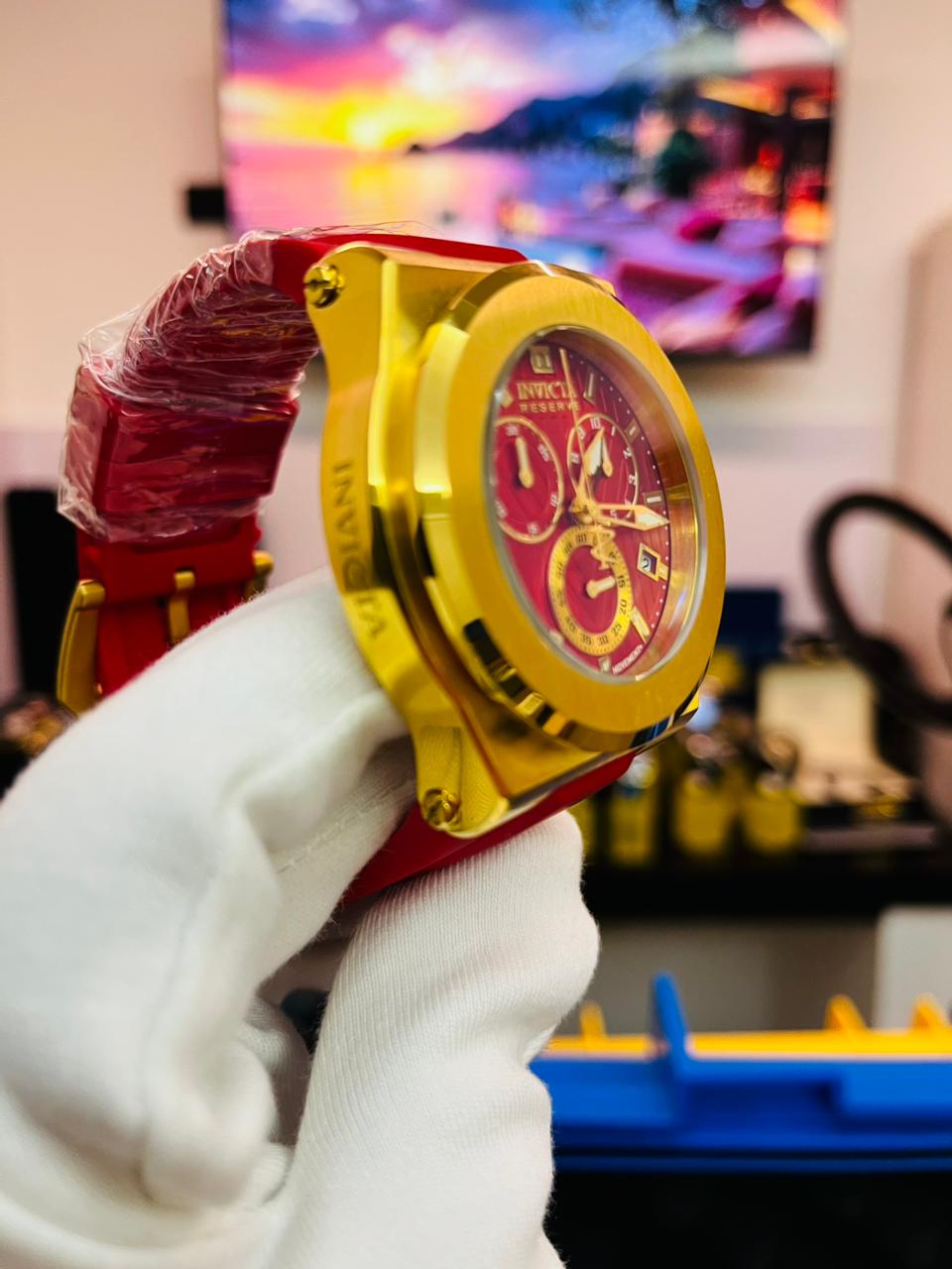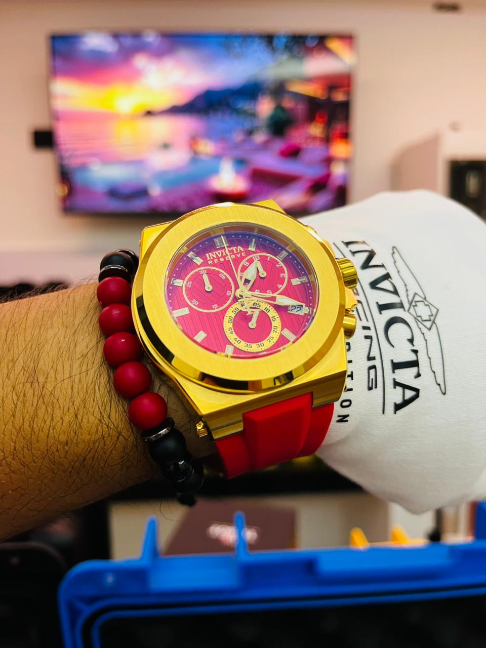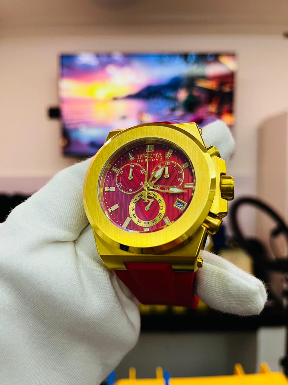 El Invicta Reserve Akula es un reloj masculino con presencia audaz y estilo deportivo. Su caja de 50 mm en acero inoxidable plateado con detalles dorados combina con una correa de silicona roja, aportando diseño dinámico y comodidad.