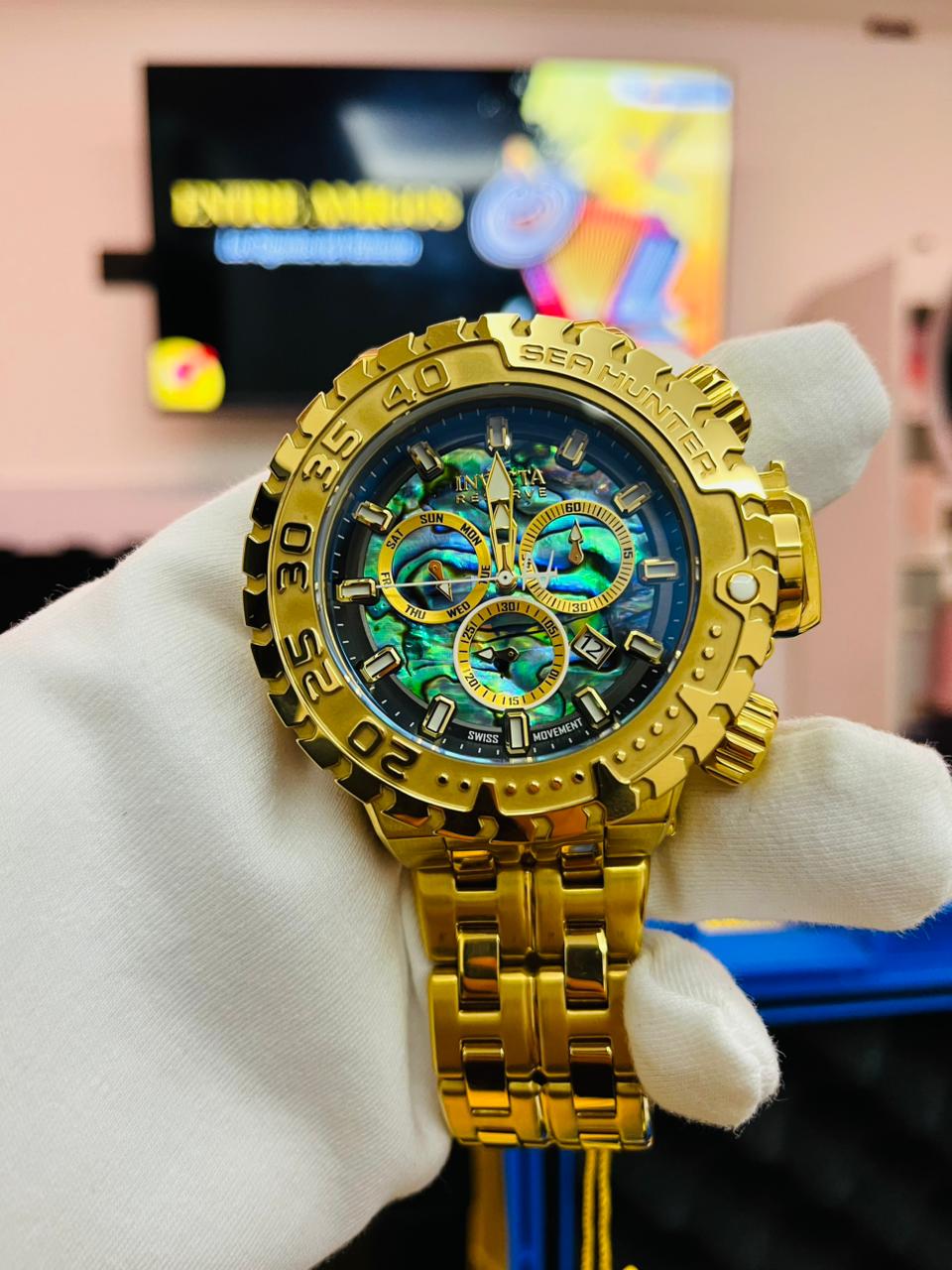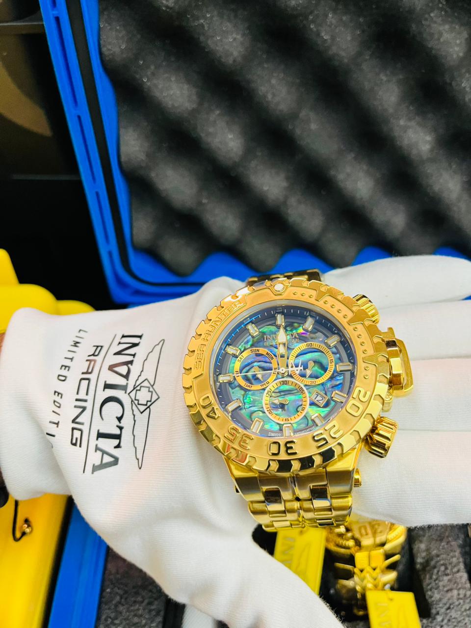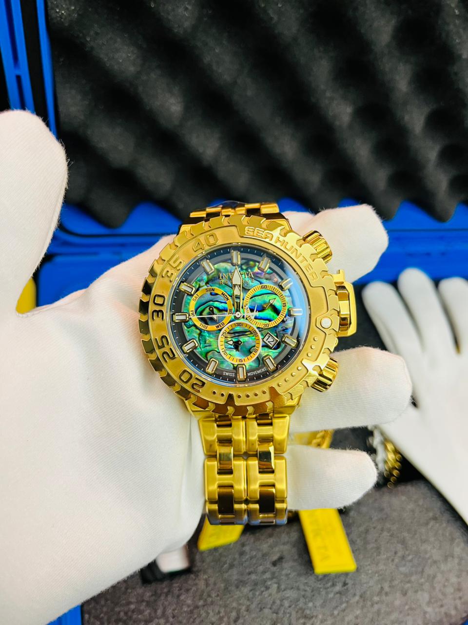 El Invicta Sea Hunter es un reloj masculino diseñado para quienes valoran potencia y estilo en una sola pieza. Su caja de 57 mm en acero inoxidable con apliques dorados ofrece presencia imponente en la muñeca y combina perfectamente con una correa de acero igualmente resistente.