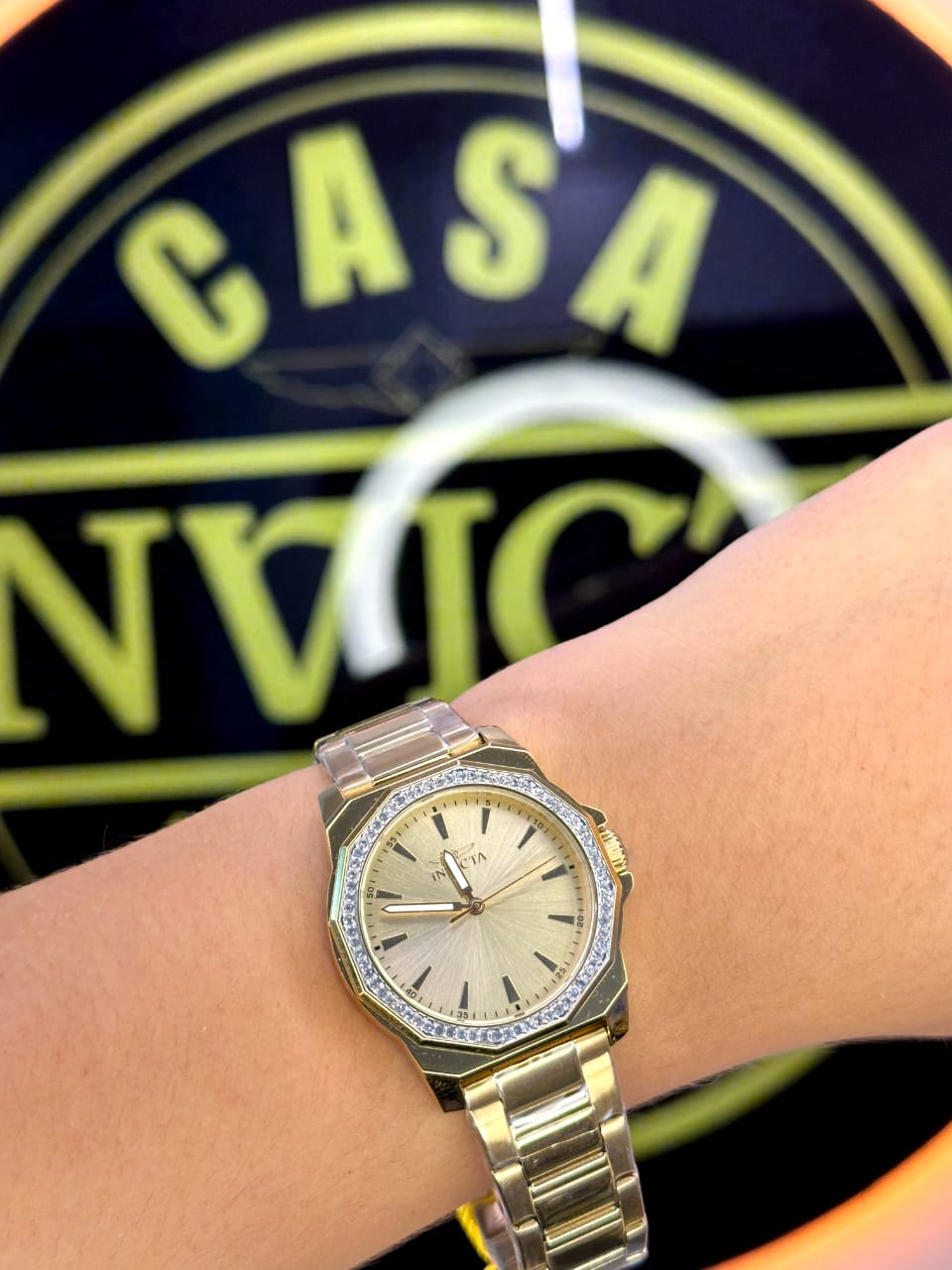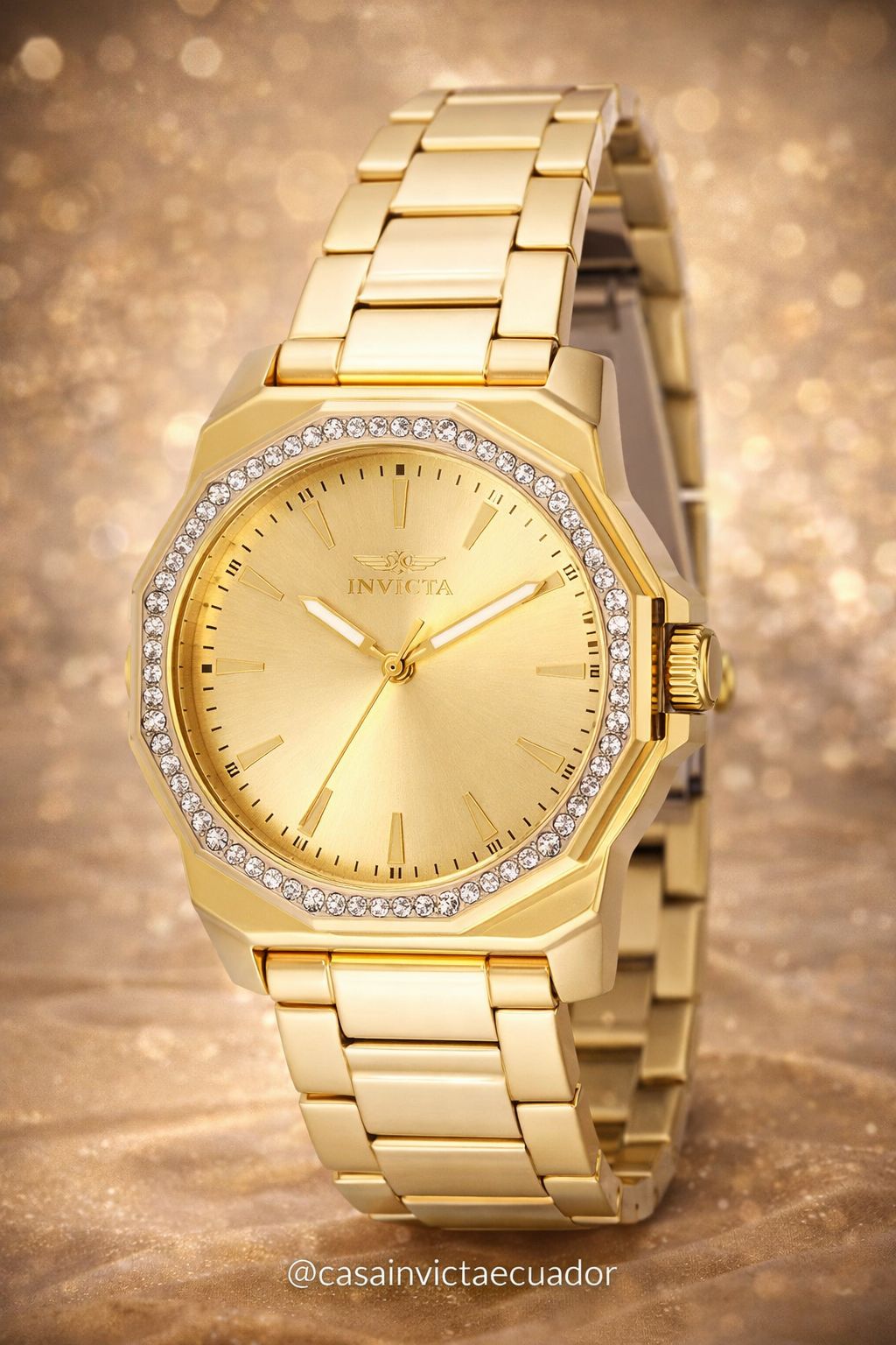 El Invicta Speedway para mujer combina elegancia y estilo con movimiento cuarzo preciso, caja de 34 mm en acero inoxidable dorado y detalles en cristales blancos sobre la esfera. Producto 100 % original con garantía en Casa Invicta Ecuador.